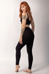 Conheça a Calça Preta Legging Maya. Por ser feita de malha de algodão com elastano, ela é extremamente confortável. A modelagem é alta, com elástico levemente brilhoso com a logomarca da Janiero na cintura.
