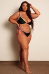 Apresentamos nossa calcinha de biquini com amarrações Pippa, feita de lycra preta levemente brilhante e contornos coloridos. Ela é toda de amarração, e possui uma modelagem mais cavada na parte frontal e menorzinha no bumbum. Para as mulheres que desejam peças menores para tomar sol e bronzear a pele.