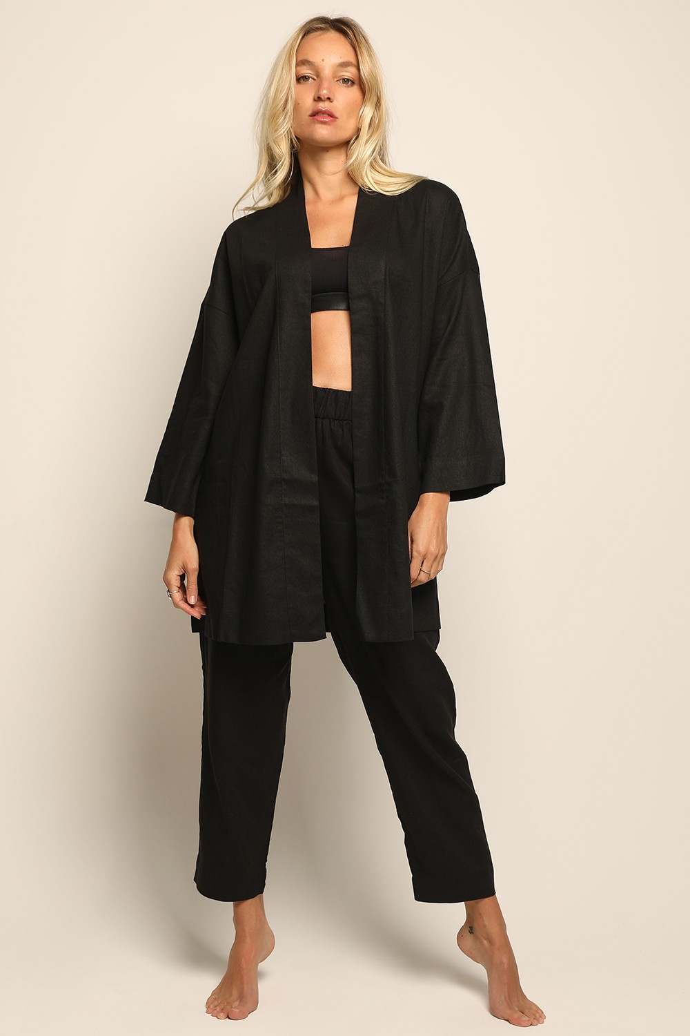 Novidade! Agora criamos roupas e apresentamos nosso amado kimono Preto Guadalupe. Feito de linho e viscose, ele transmite a naturalidade e fluidez necessária para os movimentos do dia a dia, e se torna um ótimo acessório para quem já tem uma gavetinha cheia de Janieros. Seu shape é oversized com corte mais reto e minimalista. Acompanha faixa larga para amarrações. Ideal para ser usado com nossos amados tops neste verão. Indicamos também combiná-lo com a calça ou o shorts, formando um lindo conjunto atemporal e versátil.