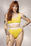 Conheça o top amarelo esportivo Esther: A modelagem é esportiva, confortável e com decote arredondado na frente e atrás. Possui elástico branco levemente brilhoso na base com a logomarca da Janiero. Liberdade para seu seio com o conforto da malha de algodão com elastano e design minimalista.